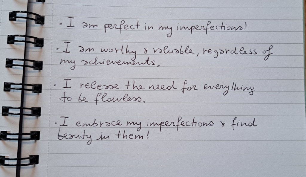 This is an affirmation which I love to repeate to myself, especially when I begin to feel overwhelmed, when I think that I am not good enough and so on. I love to write down on paper those kind of affirmations for my personal growth to remind myself that I am perfectly beautiful with all my imperfections. Recognizing that my flaws and imperfections do not define me, (they are an integral part of who I am!) it’s a good sign that I am becoming more confident with my own self! !