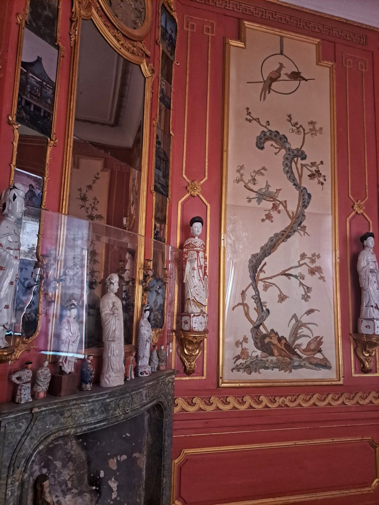 The room presents a blend of European and Chinese influences. The walls are adorned with Chinese wallpaper, while the furniture a more European Rococo style such as this chandelier, hanging in the center of the room!